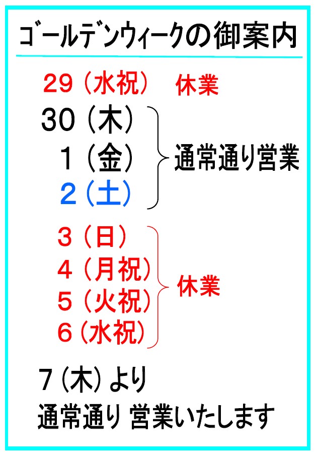弊社では、添付の通り、ゴールデンウィークの休業日とさせていただきます。